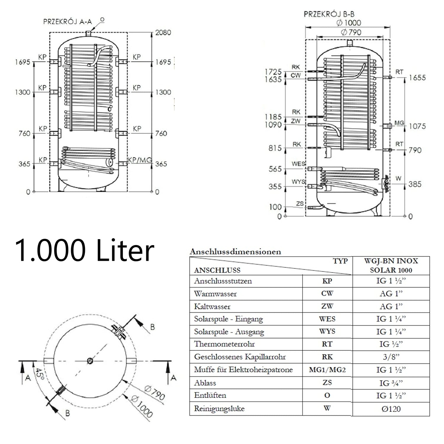 O WGJ-BN INOX SOLAR é um reservatório de acumulação combinado para aquecimento de água e água quente sanitária, com uma serpentina de aquecimento de aço inoxidável integrada como permutador de calor. Foi concebido para integração em sistemas de aquecimento central com caldeiras, bombas de calor ou para utilização de calor solar, permitindo tanto o armazenamento de energia de aquecimento como o aquecimento contínuo de água potável.
