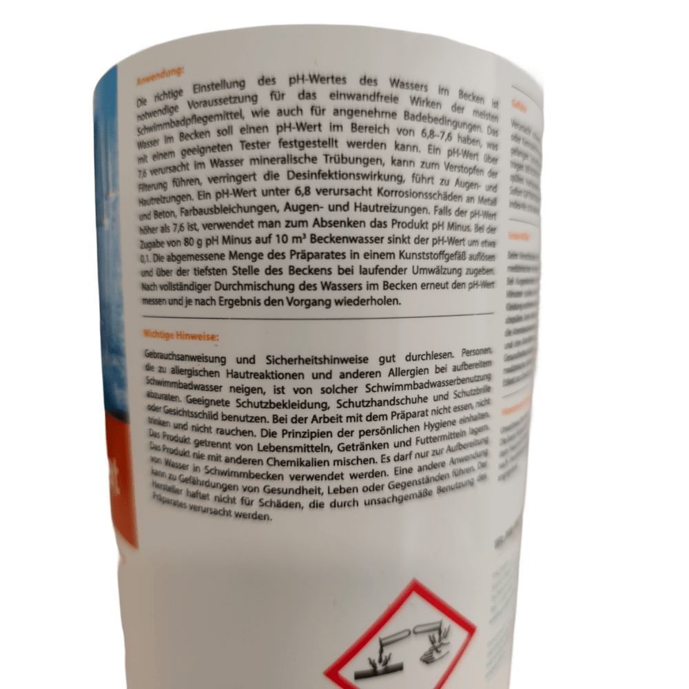 Este important de reținut că pH Minus 1,5 kg este destinat exclusiv reglării acidității și nu este potrivit pentru purificarea apei. În plus, duritatea ridicată a apei poate afecta eficacitatea produsului, așadar pot fi necesare măsuri suplimentare de stabilizare a durității în cazul apei dure.