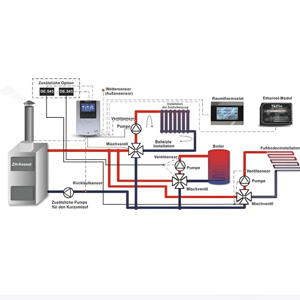 Regulátor vykurovacieho okruhu riadený vonkajšou teplotou TECH i-1 CWU (EU-i-1 DHW) Ovláda 3/4-cestný zmiešavací ventil vrátane čerpadla ventilu a prídavného čerpadla teplej vody. Prostredníctvom vonkajšieho snímača (kompenzácia podľa počasia), týždenného programu a pripojenia izbového termostatu udržiava stabilnú teplotu prívodu a umožňuje... Ochrana proti spätnému toku Na kotol. Ideálne na modernizáciu aj novostavbu – pre súkromných majiteľov domov, ako aj pre inštalatérov.